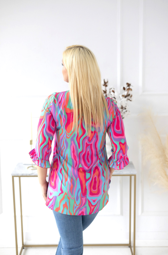 Casualowa tunika o taliowanym kroju z przewiewnej wiskozy. Dekolt okrągły z łezką połączony lamówką.