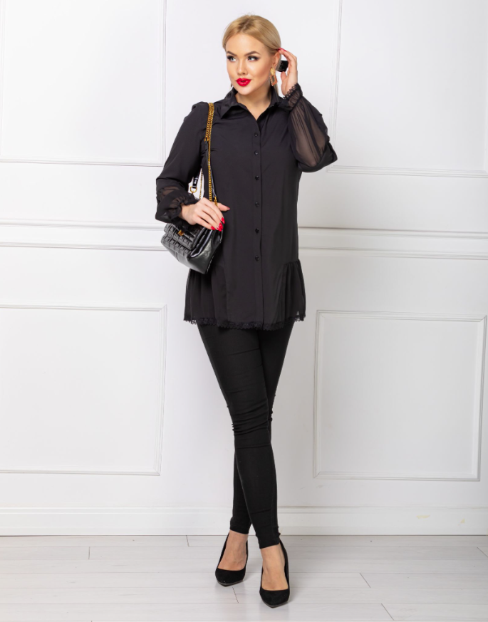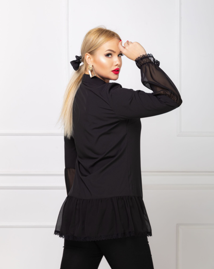 Koszula z szyfonową falbanką EWA czarna Plus Size 42-56