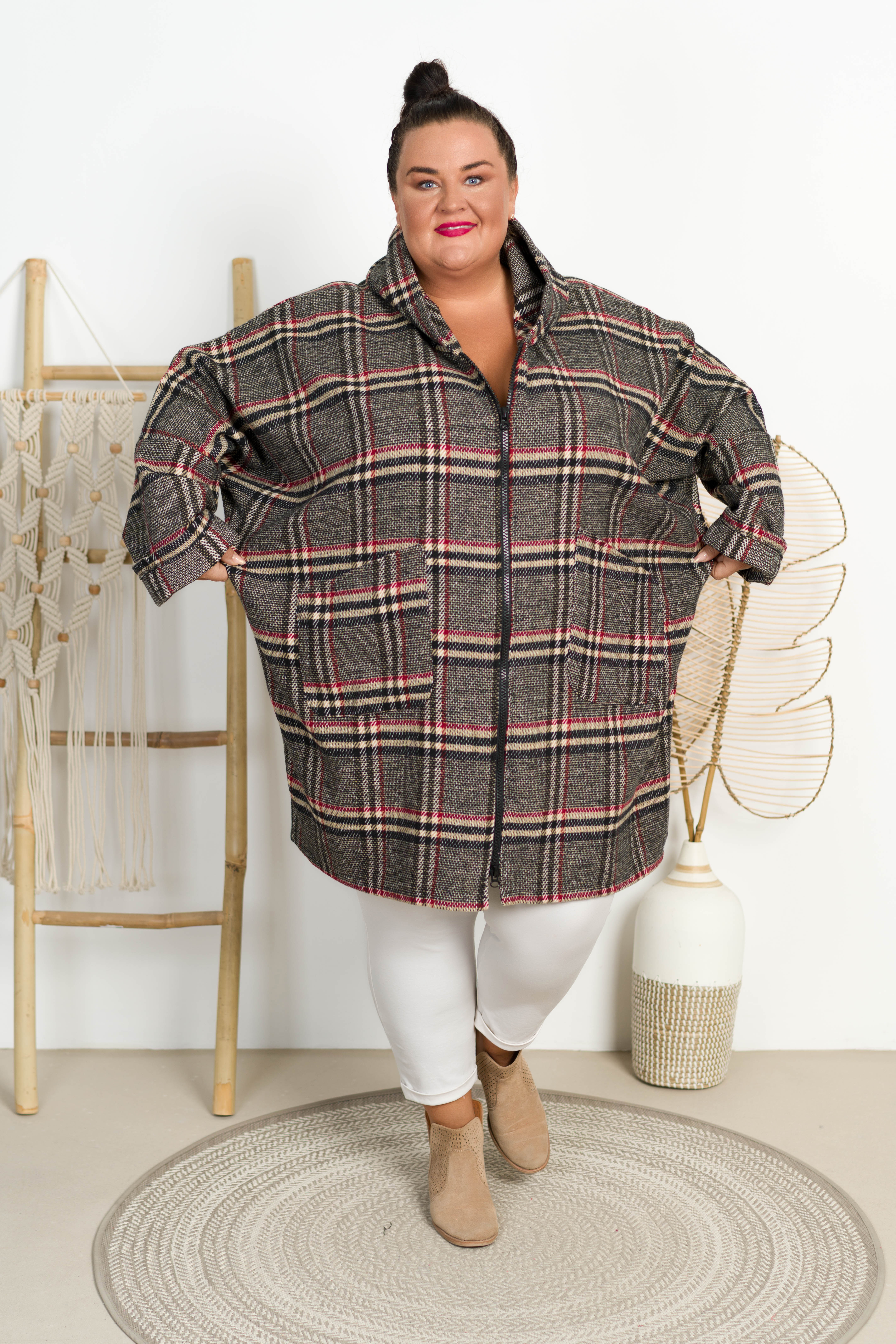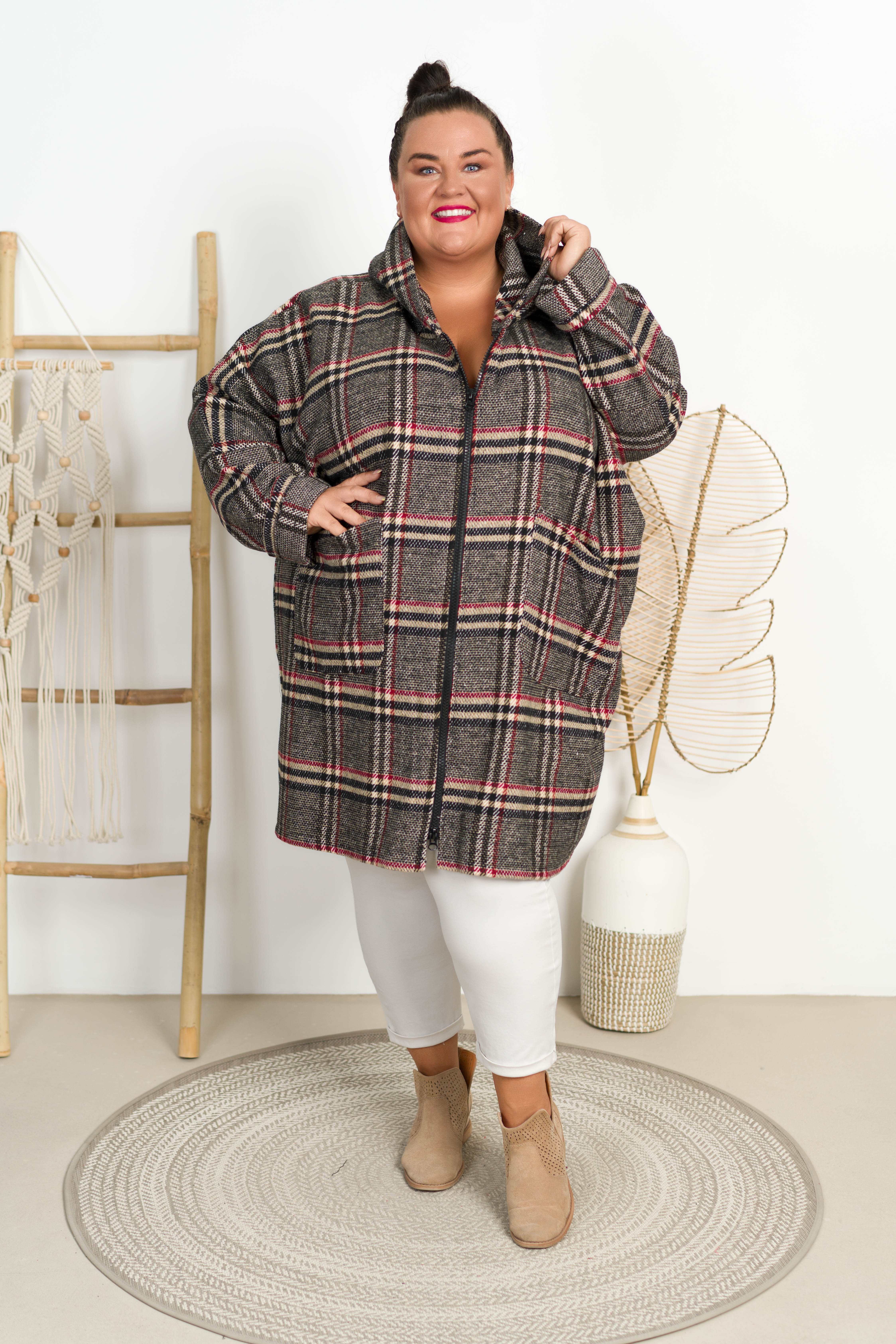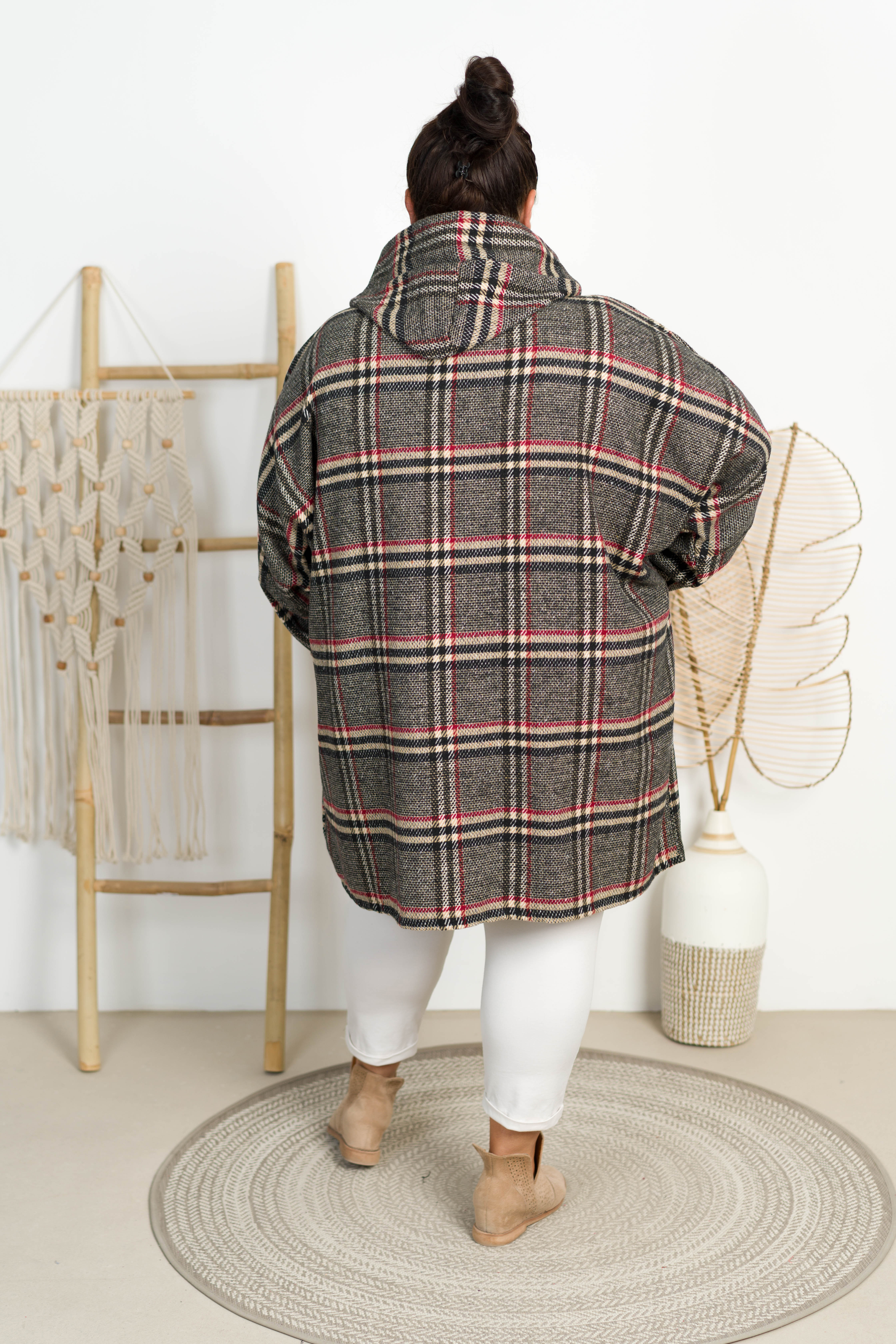 Oversizowy Płaszczyk z kapturem VENUS w kratę Plus Size 48-58