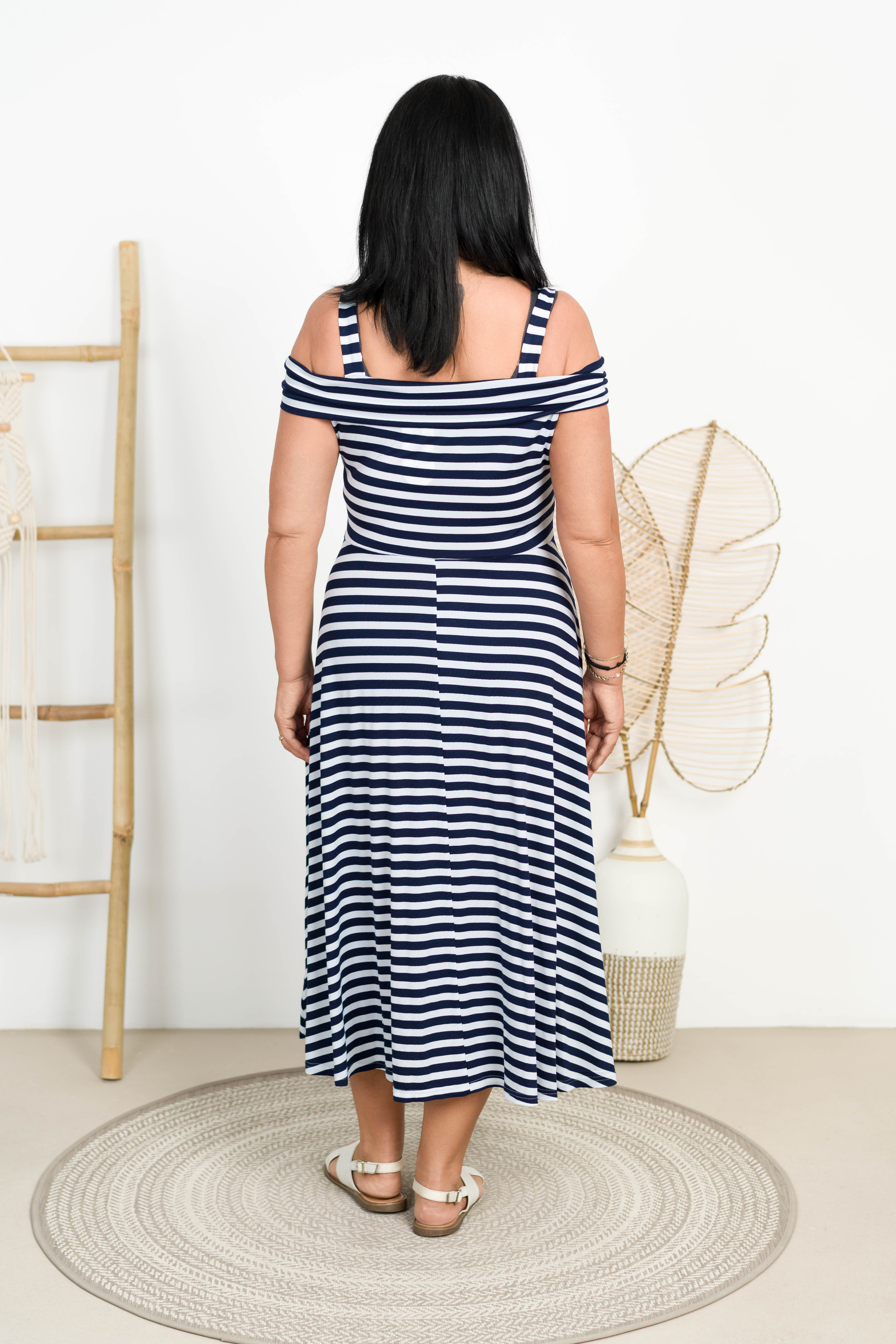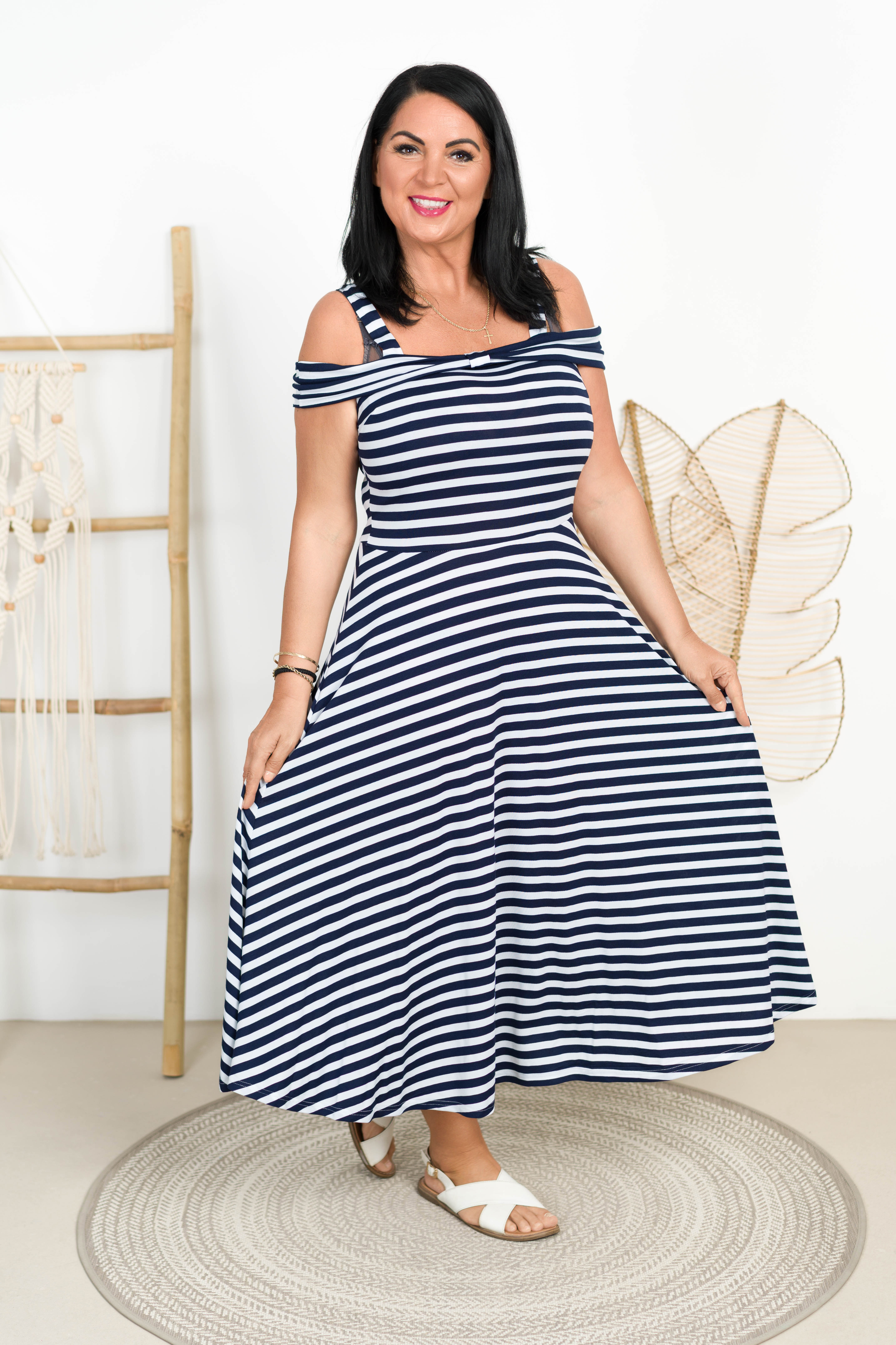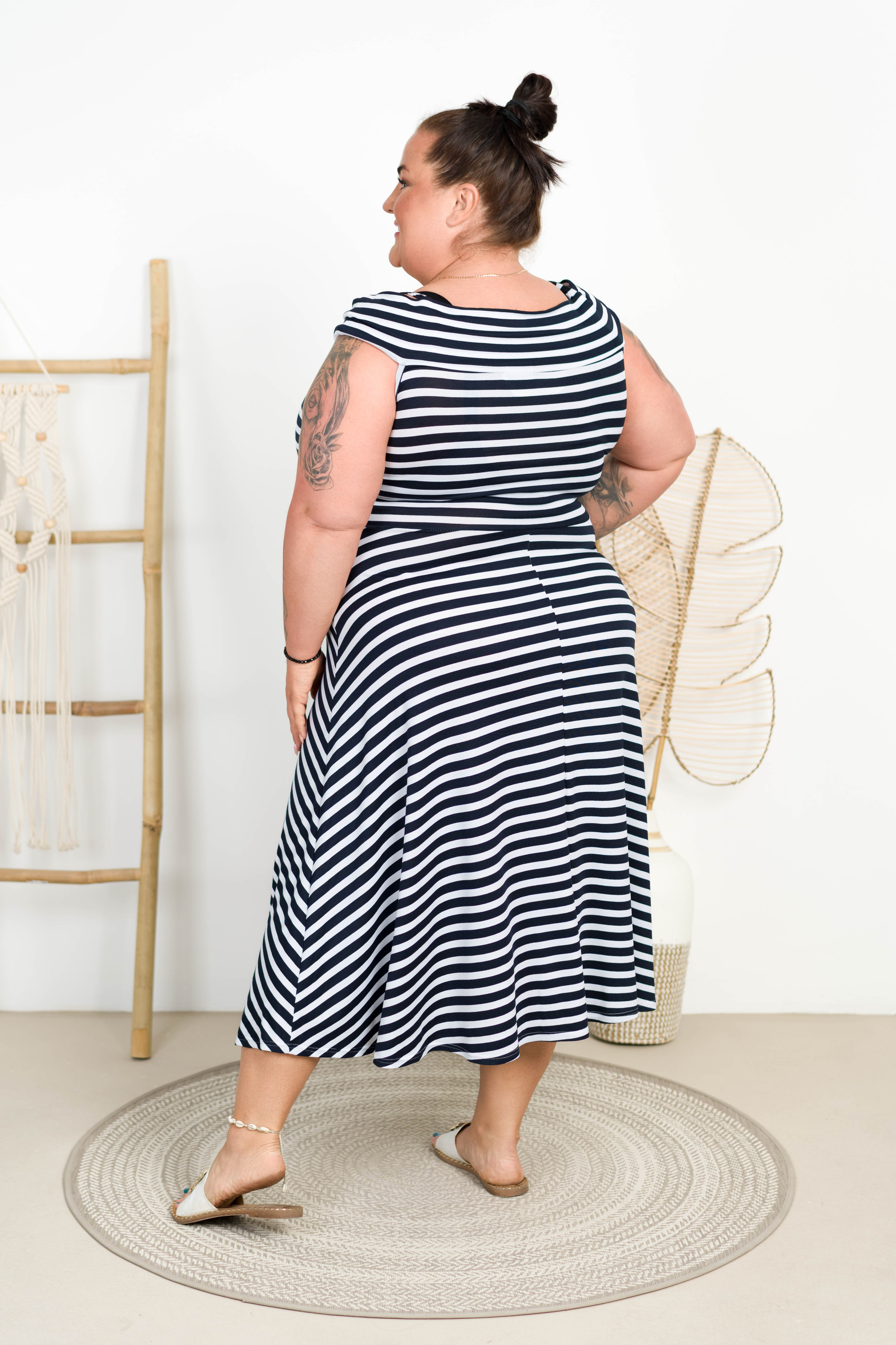 Sukienka BELLISIMA w biało-granatowe paski Plus Size 42-52