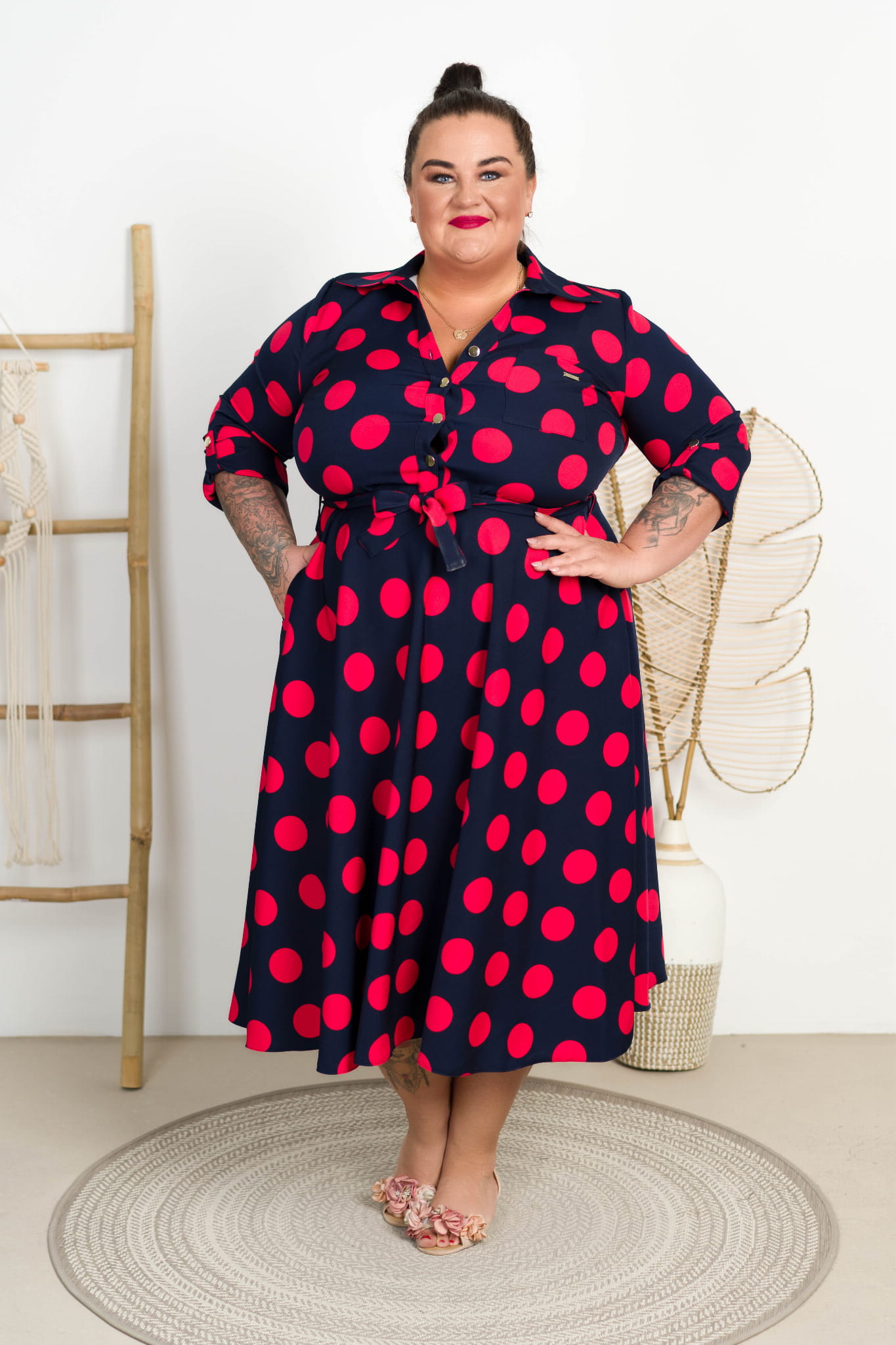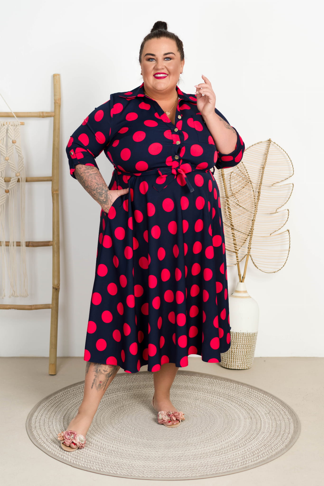 Sukienka z paskiem ILONA grochy czerwone Plus Size 44-52