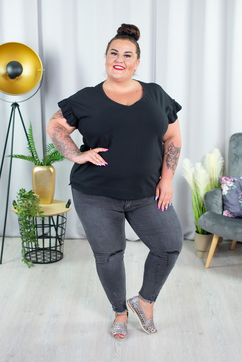 T-shirt w szpic z falbankami FERBY czarna Plus Size 42-52