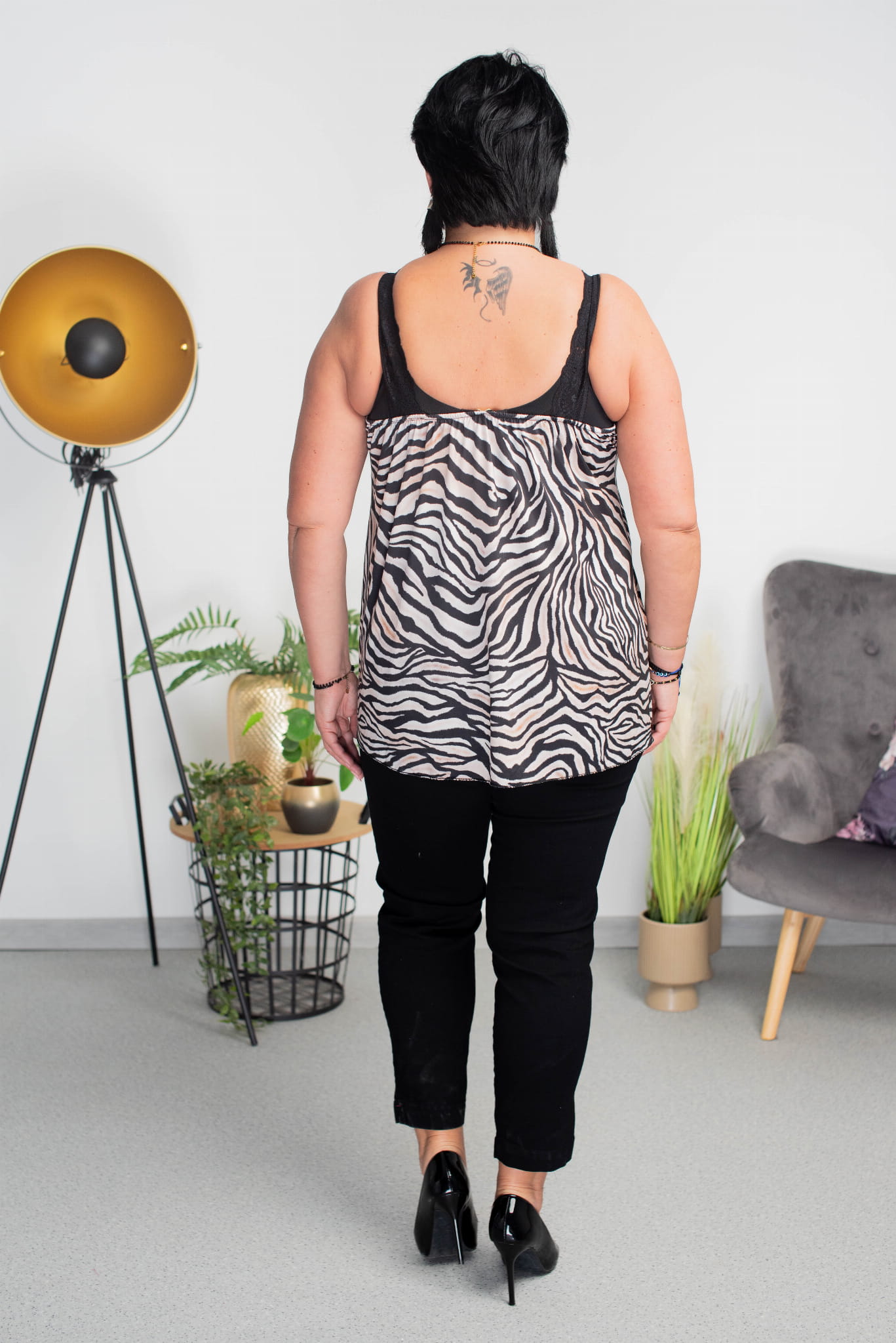 Lekko trapezowy fason, z tyłu na plecach gumka.