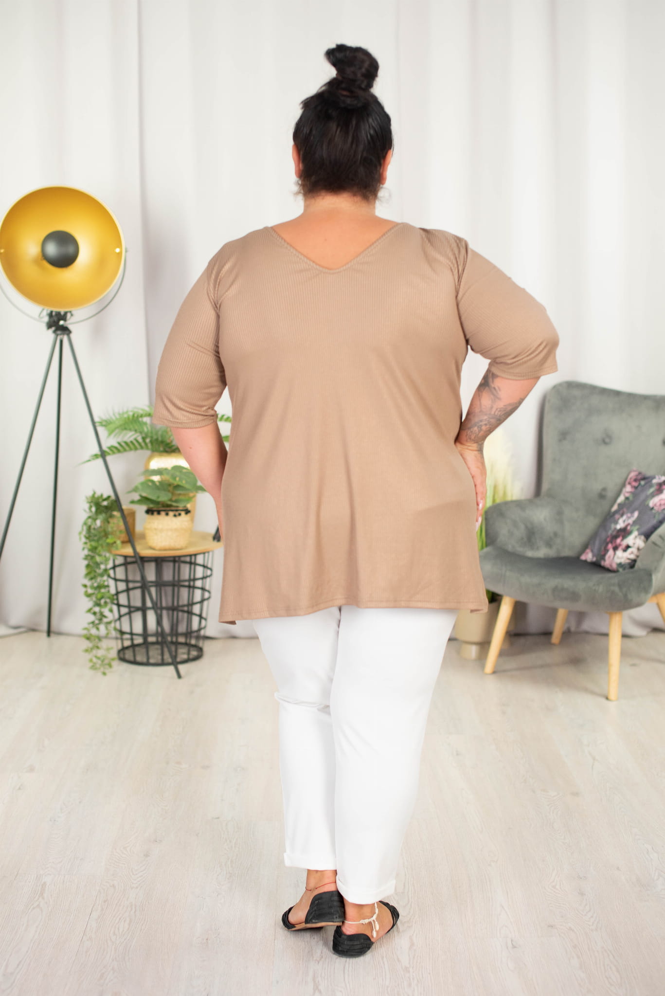 Tunika trapezowa Vneck z perełkami ATELLA camel 48-58