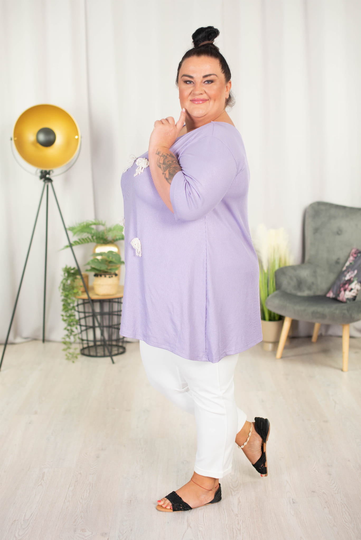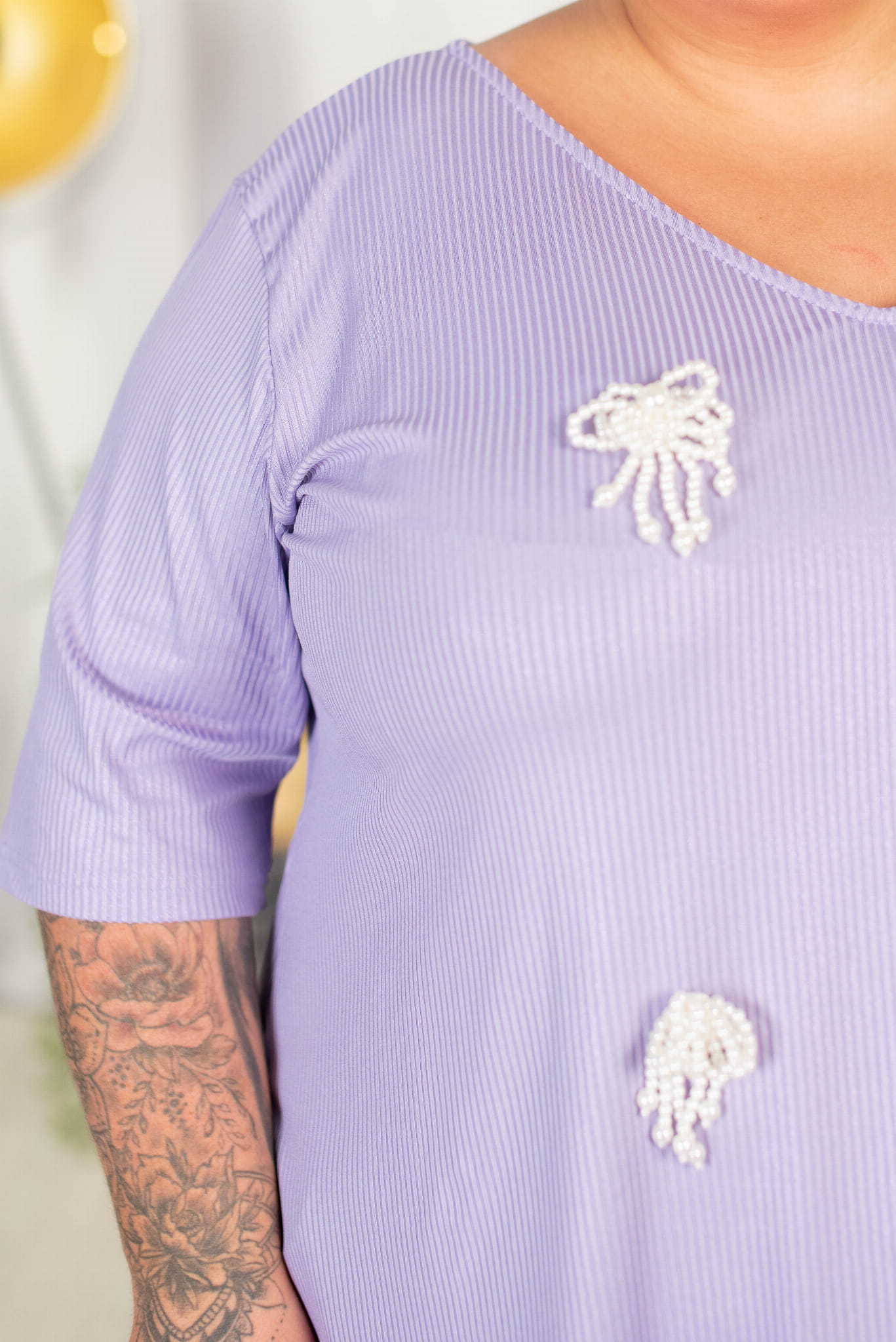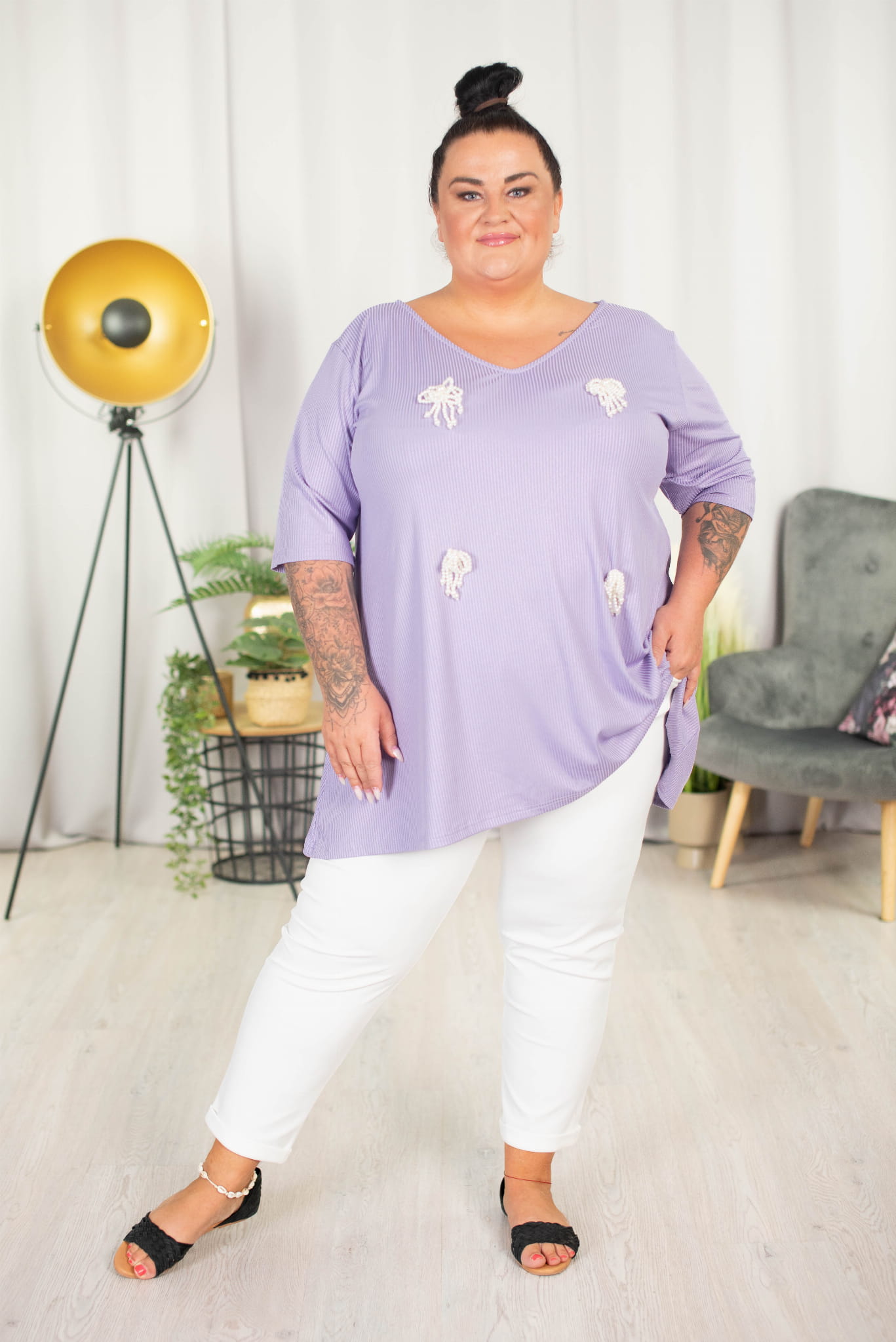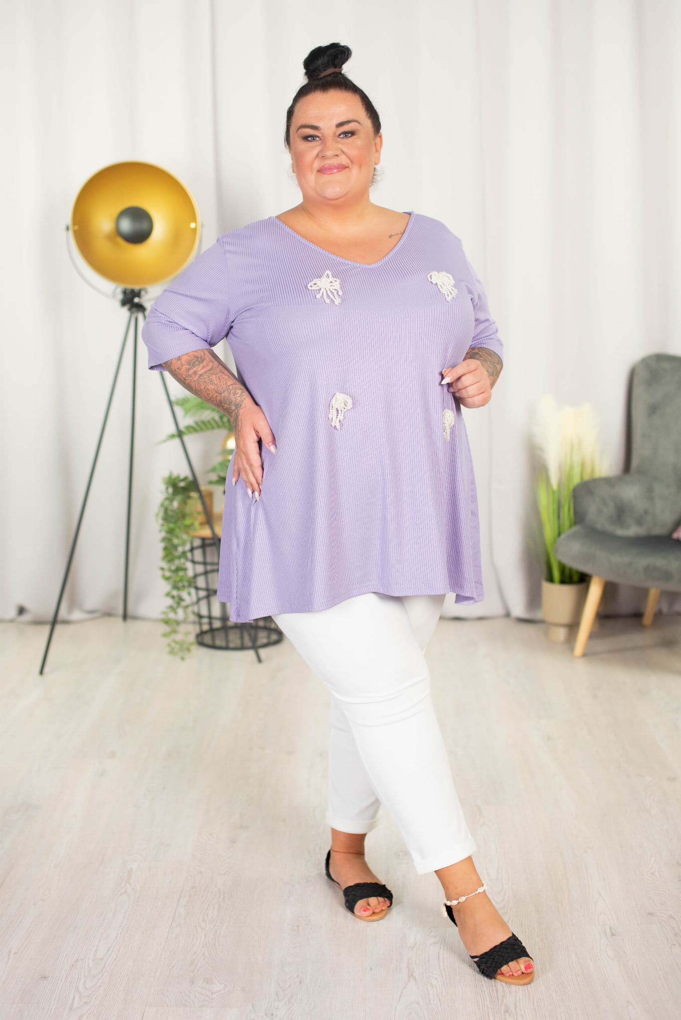 Tunika trapezowa Vneck z perełkami ATELLA lila 48-58