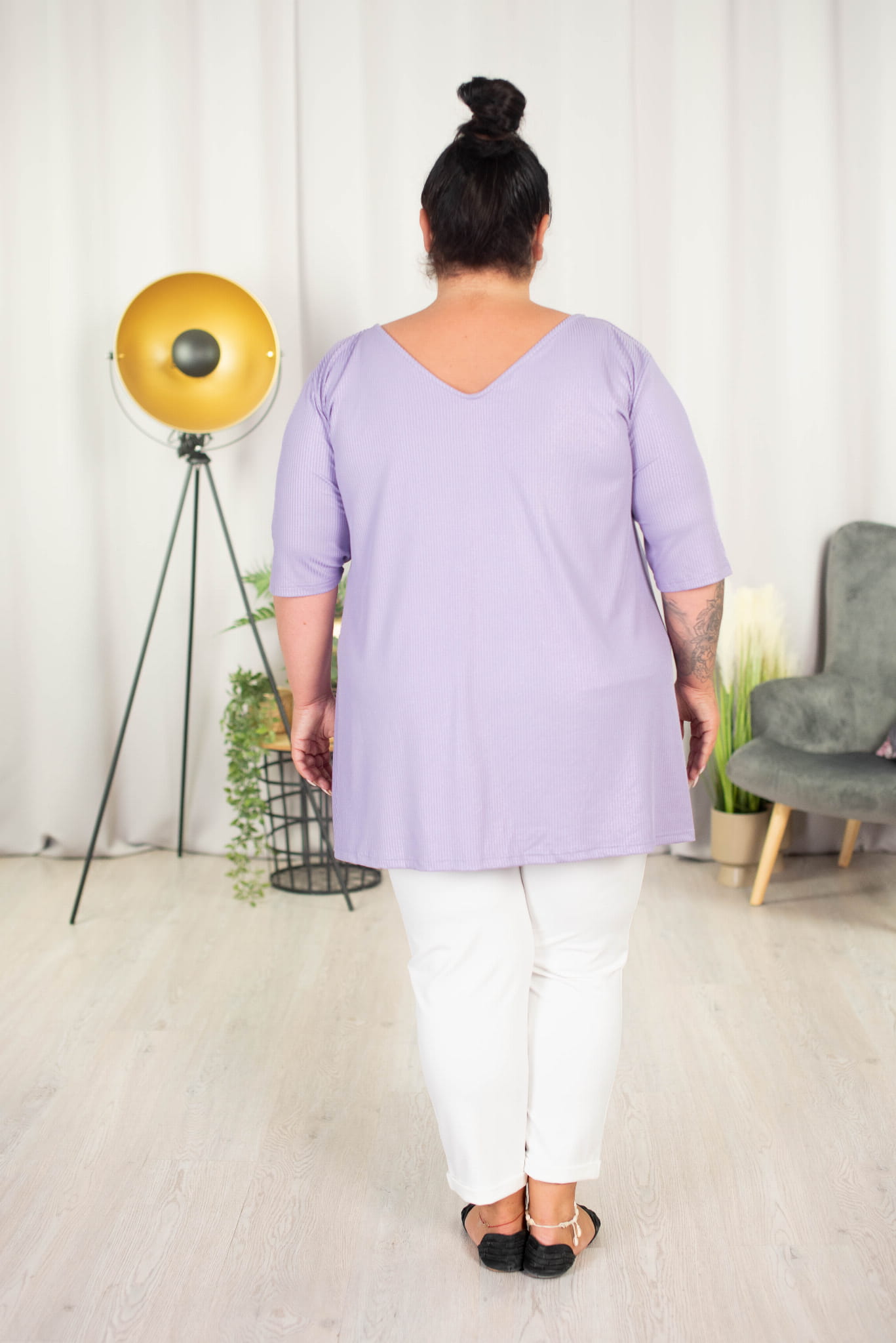 Dłuższy, trapezowy krój idealnie sprawdzi się do legginsów lub wąskich spodni.