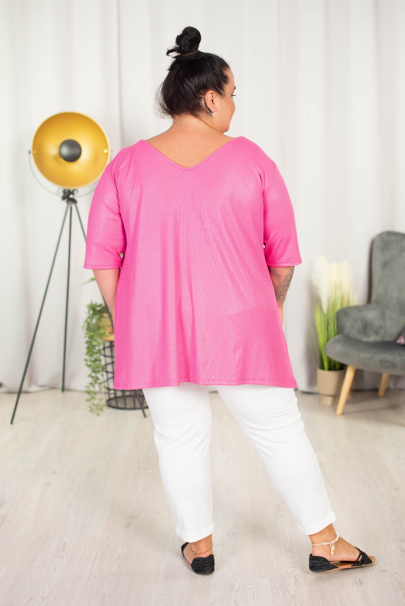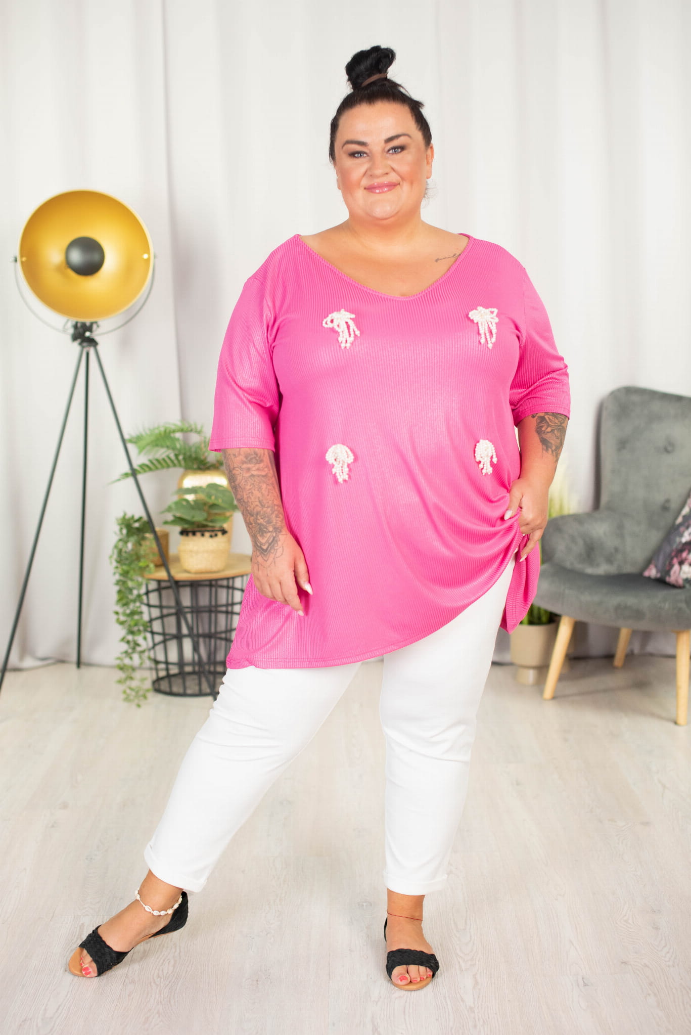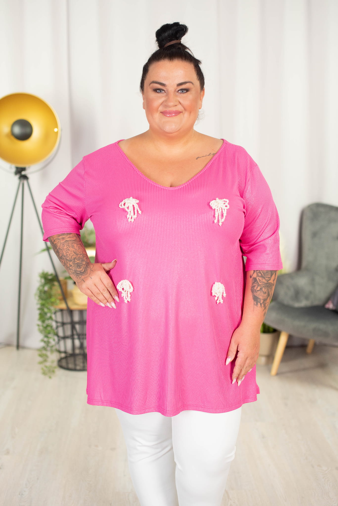 Tunika trapezowa Vneck z perełkami ATELLA róż 48-58
