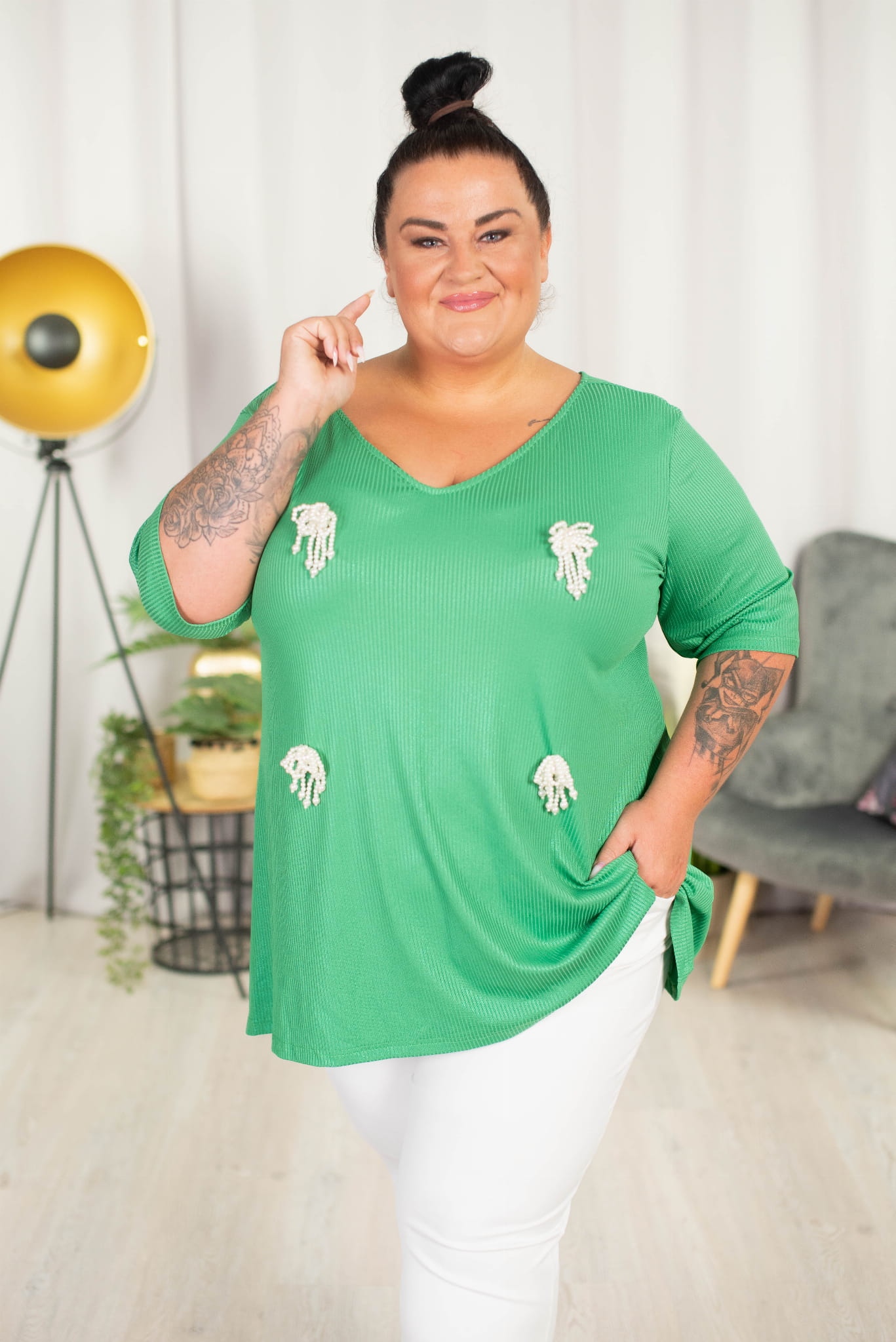 Tunika trapezowa Vneck z perełkami ATELLA zielona 48-58