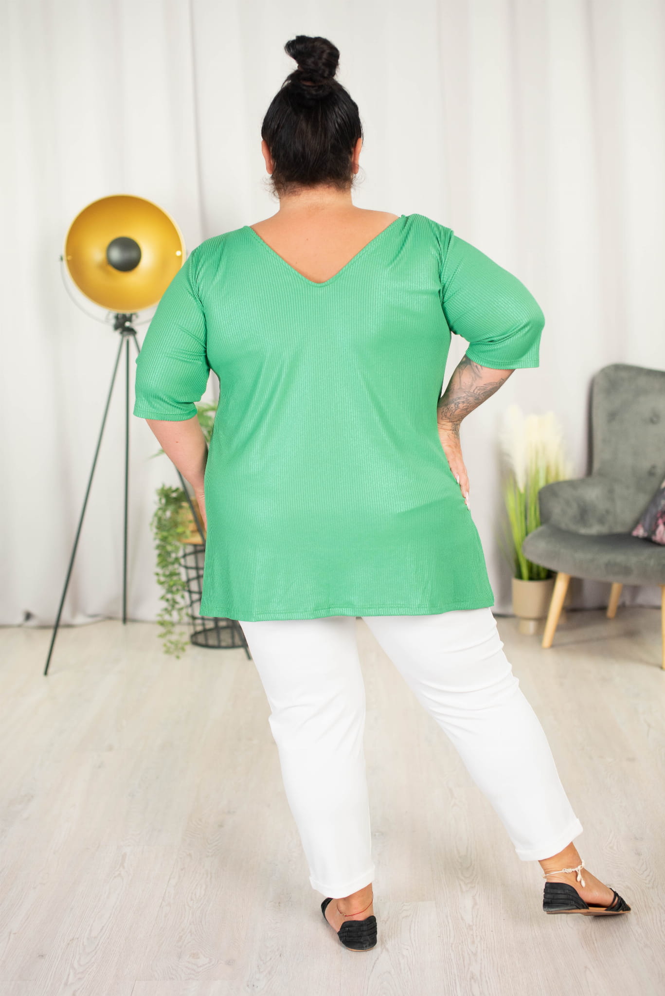 Dłuższy, trapezowy krój idealnie sprawdzi się do legginsów lub wąskich spodni.